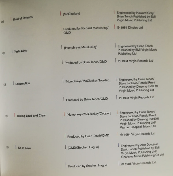 Engineer – Brian Tench Engineer – Howard Gray Producer – Orchestral Manoeuvres In The Dark Producer – Richard Manwaring Written-By – Andy McCluskey |
