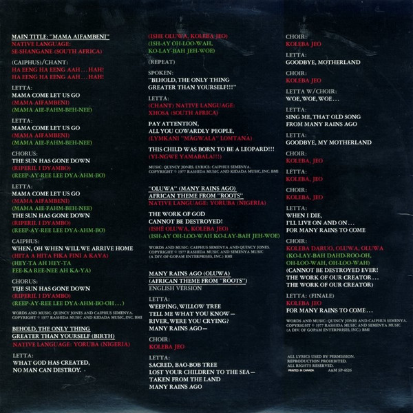 Bata [Bata Drum Ensemble, Featuring] – Bill Summers Choir [Featuring] – The Wattsline Featuring – Caiphus Semenya Vocals [Featuring] – Letta Mbulu Written-By – Caiphus Semenya Written-By – Quincy Jones |
