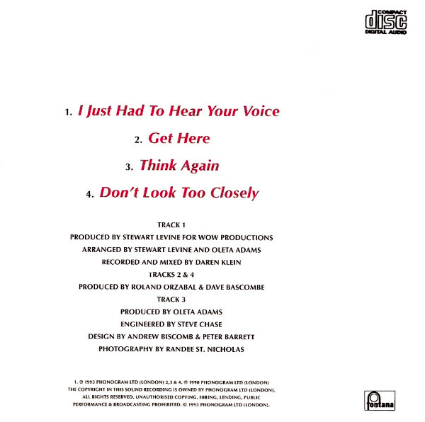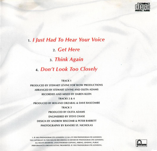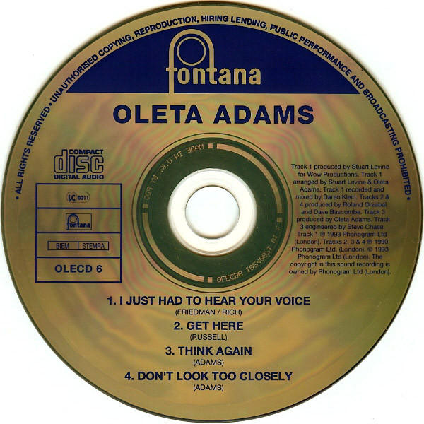 Arranged By – Oleta Adams Arranged By, Producer – Stewart Levine Mixed By, Recorded By – Daren Klein Written-By – Jud Friedman Written-By – Allan Rich |