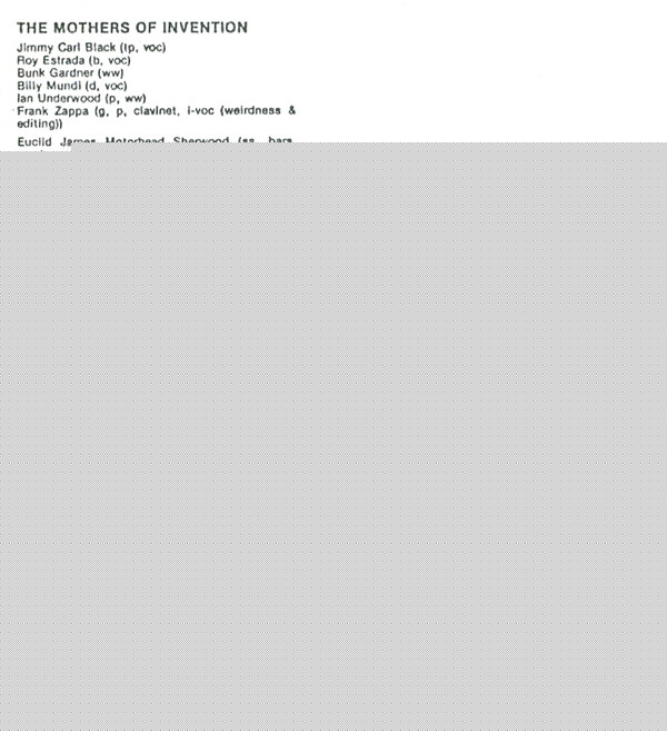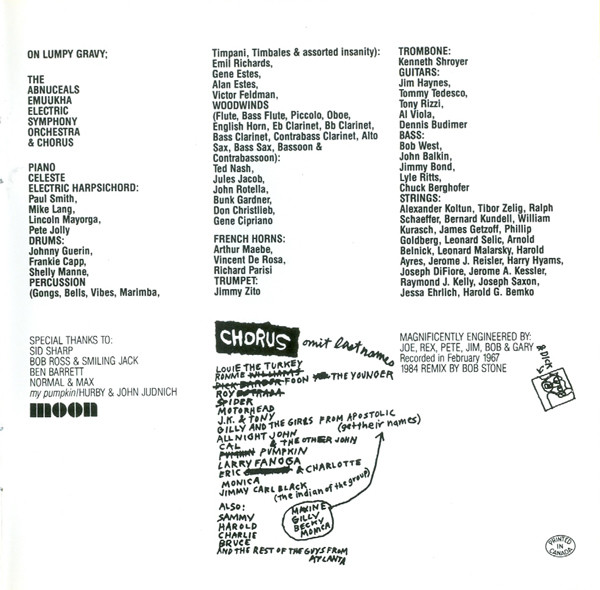 Bass – John Balkin Bass – Chuck Berghofer Bass – Jimmy Bond Bass – Bob West Bass – Lyle Ritz Chorus – Charlotte Martin Chorus – All-Night John Chorus – Spider Barbour Chorus – Louis "The Turkey" Cuneo Chorus – Pumpkin (5) Chorus – Larry Fanoga Chorus – Foon The Younger Chorus – Jimmy Carl Black Chorus – Maxine (10) Chorus – Sam Whiteside (2) Chorus – John Townley (2) Chorus – Tony (80) Chorus – Becky Wentworth Chorus – Cal Schenkel Chorus – Monica Boscia Chorus – Motorhead Sherwood Chorus – Roy Estrada Chorus – J.K. Adams Chorus – Harold Kelling Chorus – Ronnie Williams (3) Chorus – Charlie Phillips (2) Chorus – Bruce Hampton Chorus – Gilly Townley Conductor – Frank Zappa Drums – John Guerin Drums – Shelly Manne Drums – Frank Capp French Horn – Richard Perissi French Horn – Vincent DeRosa French Horn – Art Maebe Guitar [Guitars] – Tommy Tedesco Guitar [Guitars] – Jim Haynes (2) Guitar [Guitars] – Tony Rizzi Guitar [Guitars] – Al Viola Guitar [Guitars] – Dennis Budimir Orchestra, Chorus – The Abnuceals Emuukha Electric Orchestra Percussion [Gongs, Bells, Vibes, Marimba, Timpani, Timbales & Assorted Insanity] – Victor Feldman Percussion [Gongs, Bells, Vibes, Marimba, Timpani, Timbales & Assorted Insanity] – Alan Estes Percussion [Gongs, Bells, Vibes, Marimba, Timpani, Timbales & Assorted Insanity] – Gene Estes Percussion [Gongs, Bells, Vibes, Marimba, Timpani, Timbales & Assorted Insanity] – Emil Richards Piano, Celesta, Harpsichord [Electric] – Pete Jolly Piano, Celesta, Harpsichord [Electric] – Paul Smith (5) Piano, Celesta, Harpsichord [Electric] – Lincoln Mayorga Piano, Celesta, Harpsichord [Electric] – Mike Lang Strings – Joseph Difiore Strings – William Kurasch Strings – Harry Hyams Strings – Alexander Koltun Strings – Jerome Reisler Strings – Jesse Ehrlich Strings – James Getzoff Strings – Arnold Belnick Strings – Joseph Saxon Strings – Harold Ayres Strings – Bernard Kundell Strings – Leonard Malarsky Strings – Leonard Selic Strings – Harold Bemko Strings – Ray Kelley Strings – Tibor Zelig Strings – Jerome Kessler Strings – Philip Goldberg Strings – Ralph Schaeffer Trombone – Kenny Shroyer Trumpet – James Zito Woodwind [Flute, Bass Flute, Piccolo, Oboe, English Horn, Eb Clarinet, Bb Clarinet, Bass Clarinet, Contrabass Clarinet, Alto Sax, Bass Sax, Bassoon & Contrabassoon] – Jules Jacob Woodwind [Flute, Bass Flute, Piccolo, Oboe, English Horn, Eb Clarinet, Bb Clarinet, Bass Clarinet, Contrabass Clarinet, Alto Sax, Bass Sax, Bassoon & Contrabassoon] – Bunk Gardner Woodwind [Flute, Bass Flute, Piccolo, Oboe, English Horn, Eb Clarinet, Bb Clarinet, Bass Clarinet, Contrabass Clarinet, Alto Sax, Bass Sax, Bassoon & Contrabassoon] – Ted Nash (2) Woodwind [Flute, Bass Flute, Piccolo, Oboe, English Horn, Eb Clarinet, Bb Clarinet, Bass Clarinet, Contrabass Clarinet, Alto Sax, Bass Sax, Bassoon & Contrabassoon] – John Rotella Woodwind [Flute, Bass Flute, Piccolo, Oboe, English Horn, Eb Clarinet, Bb Clarinet, Bass Clarinet, Contrabass Clarinet, Alto Sax, Bass Sax, Bassoon & Contrabassoon] – Don Christlieb Woodwind [Flute, Bass Flute, Piccolo, Oboe, English Horn, Eb Clarinet, Bb Clarinet, Bass Clarinet, Contrabass Clarinet, Alto Sax, Bass Sax, Bassoon & Contrabassoon] – Gene Cipriano |