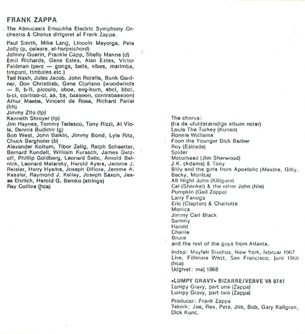 Bass – John Balkin Bass – Chuck Berghofer Bass – Jimmy Bond Bass – Bob West Bass – Lyle Ritz Chorus – Charlotte Martin Chorus – All-Night John Chorus – Spider Barbour Chorus – Louis "The Turkey" Cuneo Chorus – Pumpkin (5) Chorus – Larry Fanoga Chorus – Foon The Younger Chorus – Jimmy Carl Black Chorus – Maxine (10) Chorus – Sam Whiteside (2) Chorus – John Townley (2) Chorus – Tony (80) Chorus – Becky Wentworth Chorus – Cal Schenkel Chorus – Monica Boscia Chorus – Motorhead Sherwood Chorus – Roy Estrada Chorus – J.K. Adams Chorus – Harold Kelling Chorus – Eric Clapton Chorus – Ronnie Williams (3) Chorus – Charlie Phillips (2) Chorus – Bruce Hampton Chorus – Gilly Townley Conductor – Frank Zappa Drums – John Guerin Drums – Shelly Manne Drums – Frank Capp French Horn – Richard Perissi French Horn – Vincent DeRosa French Horn – Art Maebe Guitar [Guitars] – Tommy Tedesco Guitar [Guitars] – Jim Haynes (2) Guitar [Guitars] – Tony Rizzi Guitar [Guitars] – Al Viola Guitar [Guitars] – Dennis Budimir Orchestra, Chorus – The Abnuceals Emuukha Electric Orchestra Percussion [Gongs, Bells, Vibes, Marimba, Timpani, Timbales & Assorted Insanity] – Victor Feldman Percussion [Gongs, Bells, Vibes, Marimba, Timpani, Timbales & Assorted Insanity] – Alan Estes Percussion [Gongs, Bells, Vibes, Marimba, Timpani, Timbales & Assorted Insanity] – Gene Estes Percussion [Gongs, Bells, Vibes, Marimba, Timpani, Timbales & Assorted Insanity] – Emil Richards Piano, Celesta, Harpsichord [Electric] – Pete Jolly Piano, Celesta, Harpsichord [Electric] – Paul Smith (5) Piano, Celesta, Harpsichord [Electric] – Lincoln Mayorga Piano, Celesta, Harpsichord [Electric] – Mike Lang Strings – Joseph Difiore Strings – William Kurasch Strings – Harry Hyams Strings – Alexander Koltun Strings – Jerome Reisler Strings – Jesse Ehrlich Strings – James Getzoff Strings – Arnold Belnick Strings – Joseph Saxon Strings – Harold Ayres Strings – Bernard Kundell Strings – Leonard Malarsky Strings – Leonard Selic Strings – Harold Bemko Strings – Ray Kelley Strings – Tibor Zelig Strings – Jerome Kessler Strings – Philip Goldberg Strings – Ralph Schaeffer Trombone – Kenny Shroyer Trumpet – James Zito Woodwind [Flute, Bass Flute, Piccolo, Oboe, English Horn, Eb Clarinet, Bb Clarinet, Bass Clarinet, Contrabass Clarinet, Alto Sax, Bass Sax, Bassoon & Contrabassoon] – Jules Jacob Woodwind [Flute, Bass Flute, Piccolo, Oboe, English Horn, Eb Clarinet, Bb Clarinet, Bass Clarinet, Contrabass Clarinet, Alto Sax, Bass Sax, Bassoon & Contrabassoon] – Bunk Gardner Woodwind [Flute, Bass Flute, Piccolo, Oboe, English Horn, Eb Clarinet, Bb Clarinet, Bass Clarinet, Contrabass Clarinet, Alto Sax, Bass Sax, Bassoon & Contrabassoon] – Ted Nash (2) Woodwind [Flute, Bass Flute, Piccolo, Oboe, English Horn, Eb Clarinet, Bb Clarinet, Bass Clarinet, Contrabass Clarinet, Alto Sax, Bass Sax, Bassoon & Contrabassoon] – John Rotella Woodwind [Flute, Bass Flute, Piccolo, Oboe, English Horn, Eb Clarinet, Bb Clarinet, Bass Clarinet, Contrabass Clarinet, Alto Sax, Bass Sax, Bassoon & Contrabassoon] – Don Christlieb Woodwind [Flute, Bass Flute, Piccolo, Oboe, English Horn, Eb Clarinet, Bb Clarinet, Bass Clarinet, Contrabass Clarinet, Alto Sax, Bass Sax, Bassoon & Contrabassoon] – Gene Cipriano |