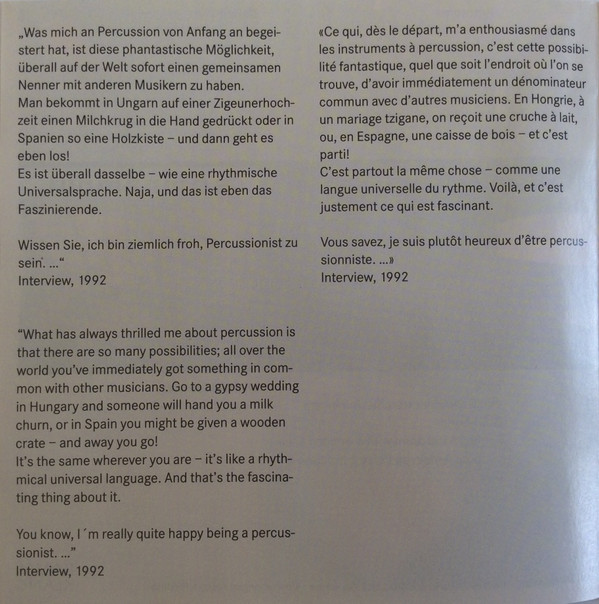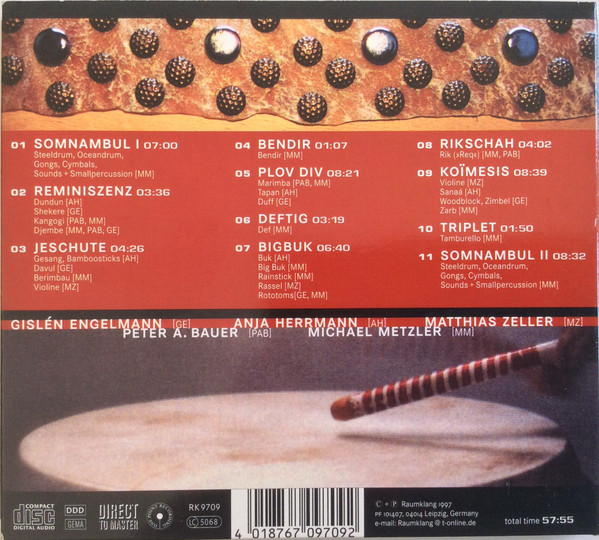 Buk – Anja Herrmann Buk [Bigbuk], Rainstick – Michael Metzler Rattle [Rassel] – Matthias Zeller (2) Rototoms – Michael Metzler Rototoms – Gislén Engelmann |