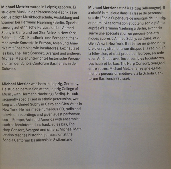 Steel Drums [Steeldrum], Drum [Oceandrum], Gong [Gongs], Cymbal [Cymbals], Sounds, Percussion [Smallpercussion] – Michael Metzler |