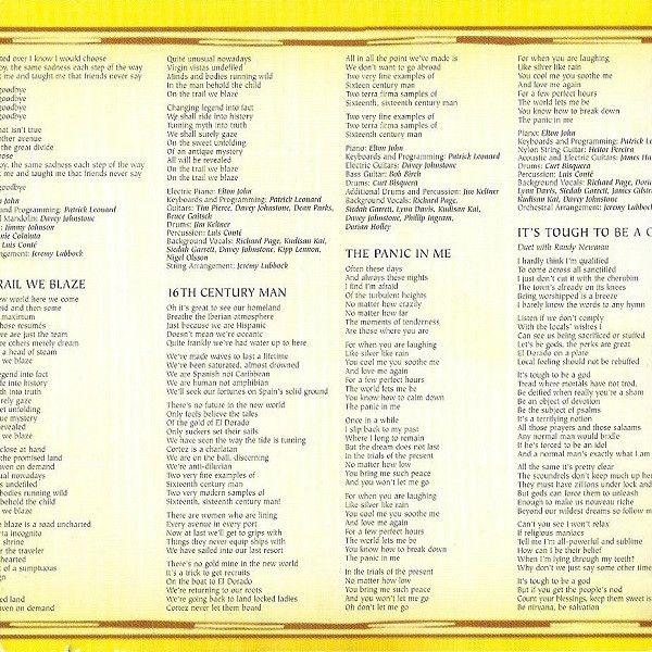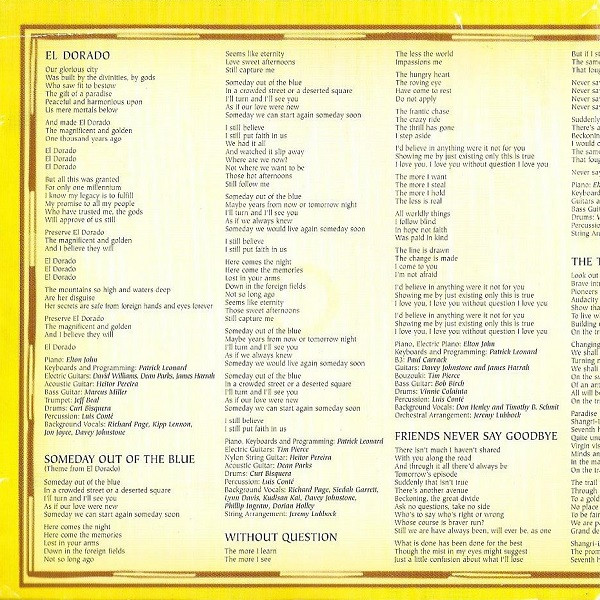 Arranged By [Orchestral Arrangment] – Jeremy Lubbock Backing Vocals [Background Vocals] – Timothy B. Schmit Backing Vocals [Background Vocals] – Don Henley Bass Guitar – Bob Birch Bouzouki – Tim Pierce Drums – Vinnie Colaiuta Guitar – James Harrah Guitar – Davey Johnstone Keyboards, Programmed By [Programming] – Patrick Leonard Organ [B3] – Paul Carrack Percussion – Luis Conte Piano, Electric Piano – Elton John |
