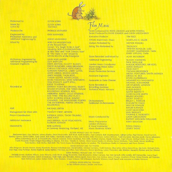 Acoustic Guitar, Electric Guitar – James Harrah Arranged By [Orchestral Arrangment] – Jeremy Lubbock Backing Vocals [Background Vocals] – Lynn Davis Backing Vocals [Background Vocals] – Kudisan Kai Backing Vocals [Background Vocals] – Jim Gilstrap Backing Vocals [Background Vocals] – Dorian Holley Backing Vocals [Background Vocals] – Richard Page Backing Vocals [Background Vocals] – Siedah Garrett Backing Vocals [Background Vocals] – Davey Johnstone Drums – Curt Bisquera Guitar [Nylon String Guitar] – Heitor Pereira Keyboards, Programmed By [Programming] – Patrick Leonard Mixed By – Kevin Killen Music By – Hans Zimmer Music By – Elton John Percussion – Luis Conte Piano – Elton John |