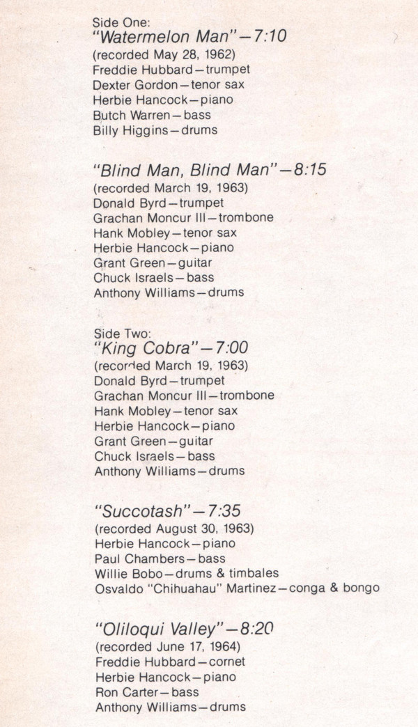 Bass – Paul Chambers (3) Congas, Bongos – Osvaldo Martinez Drums, Timbales – Willie Bobo Piano – Herbie Hancock |