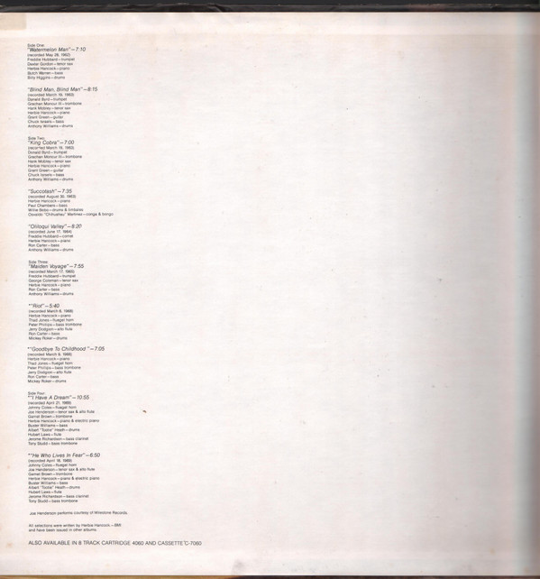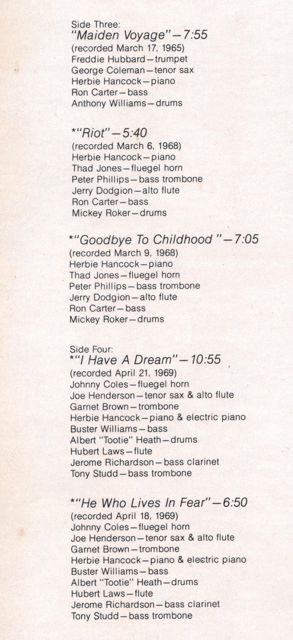 Bass – Buster Williams Bass Clarinet – Jerome Richardson Bass Trombone – Tony Studd Drums – Albert Heath Flugelhorn – Johnny Coles Flute – Hubert Laws Piano, Electric Piano – Herbie Hancock Tenor Saxophone, Alto Flute – Joe Henderson Trombone – Garnett Brown |