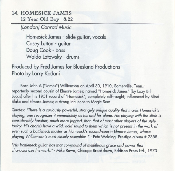 Homesick James Bass – Doug Cook (5) Drums – Waldo LaTowsky Guitar – Casey Lutton Producer [Produced By] – Fred James Slide Guitar, Vocals – Homesick James Written-By – Mel London |