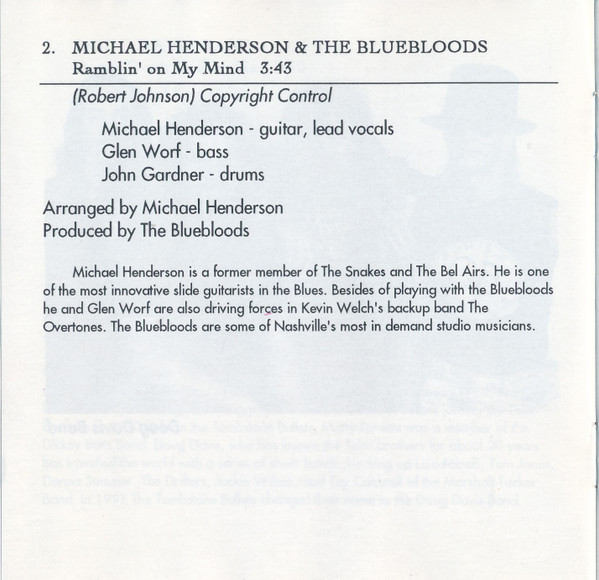 The Bluebloods Mike Henderson Arranged By – Mike Henderson Bass – Glenn Worf Drums – Glenn Worf Lead Vocals, Guitar – Mike Henderson Producer [Produced By] – The Bluebloods Written-By – Robert Johnson |