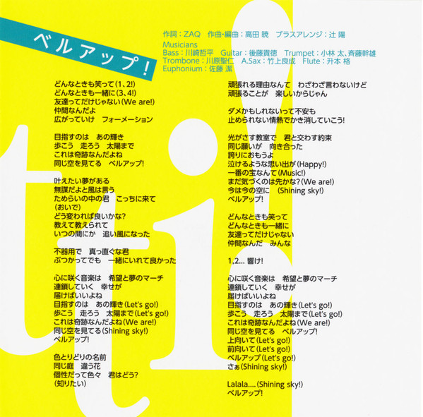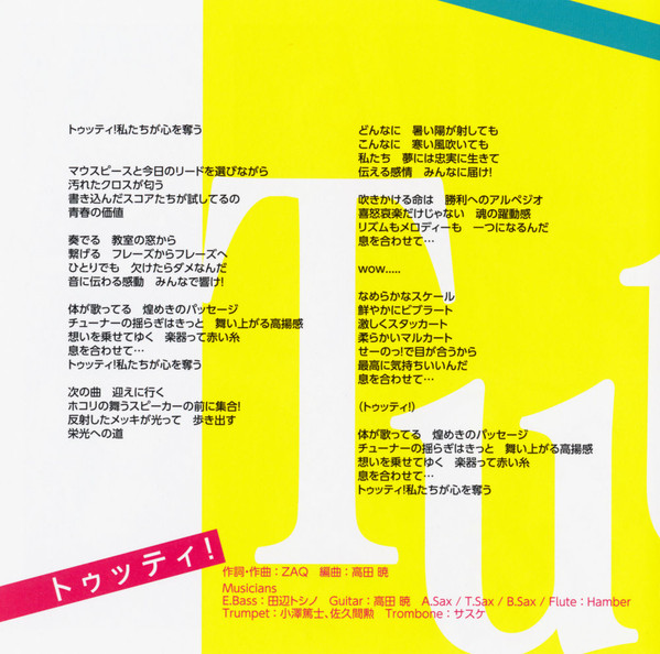 Alto Saxophone [A.Sax] – Yoshinari Takegami Arranged By [ブラスアレンジ] – Yo Tsuji Bass – Teppei Kawasaki Composed By – Kyo Takada Euphonium – Kiyoshi Sato Flute – Itaru Matsumoto Guitar – Takanori Goto Trombone – Masahito Kawahara Trumpet – Mikio Saito Trumpet – Futoshi Kobayashi |