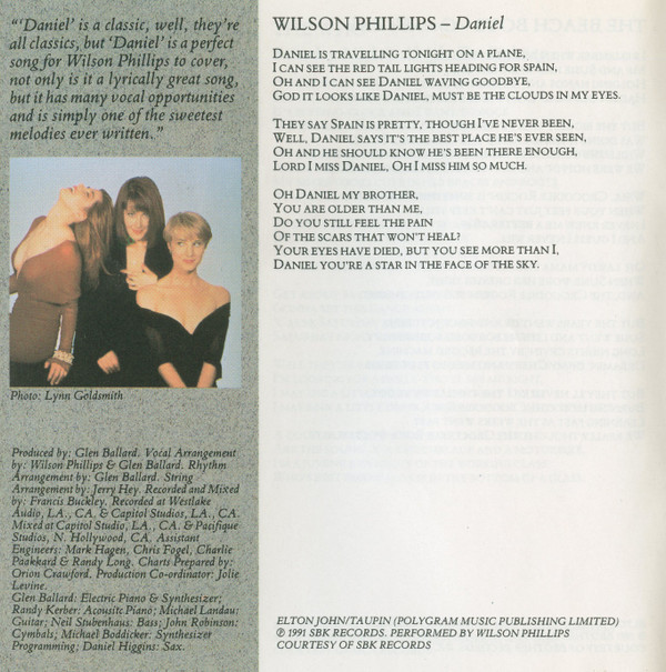 Wilson Phillips Arranged By [Strings] – Jerry Hey Arranged By [Vocals] – Wilson Phillips Arranged By, Electric Piano, Keyboards – Glen Ballard Bass – Neil Stubenhaus Cymbal – John Robinson (2) Engineer [Assistant] – Chris Fogel Engineer [Assistant] – Mark Hagen Engineer [Assistant] – Charlie Paakkari Engineer [Assistant] – Randy Long Guitar – Michael Landau Other [Charts Prepared By] – Orion Crawford Other [Production Co-ordinator] – Jolie Levine Piano [Acoustic] – Randy Kerber Producer – Glen Ballard Programmed By [Keyboards] – Michael Boddicker Recorded By, Mixed By – Francis Buckley Saxophone – Dan Higgins |
