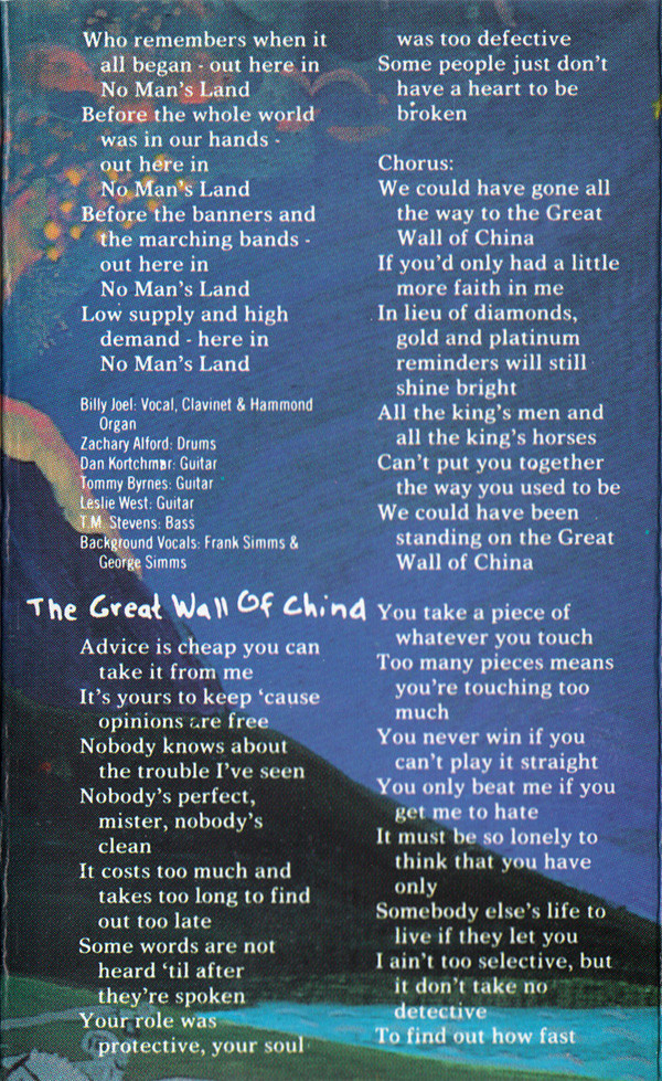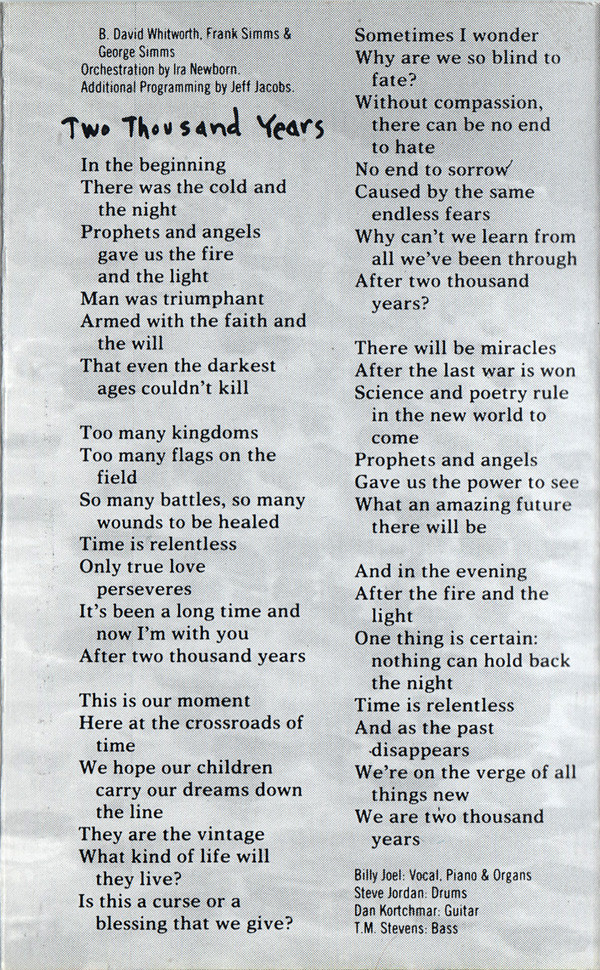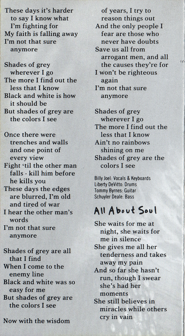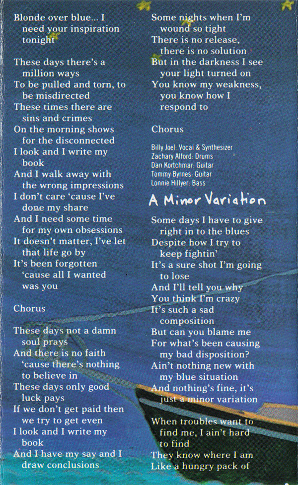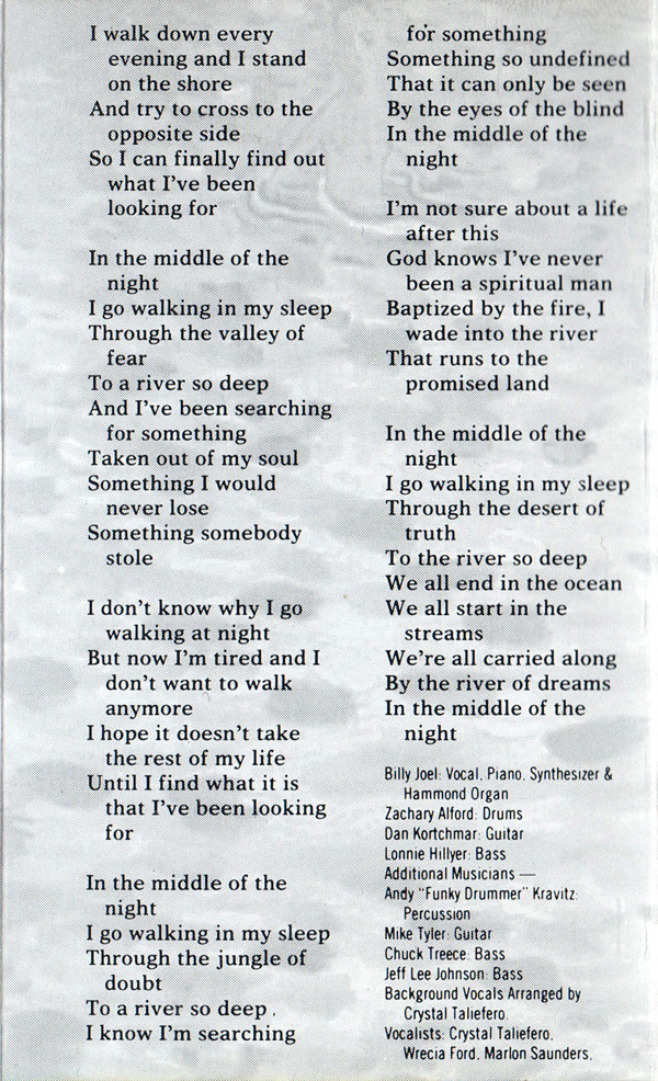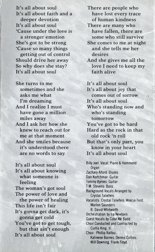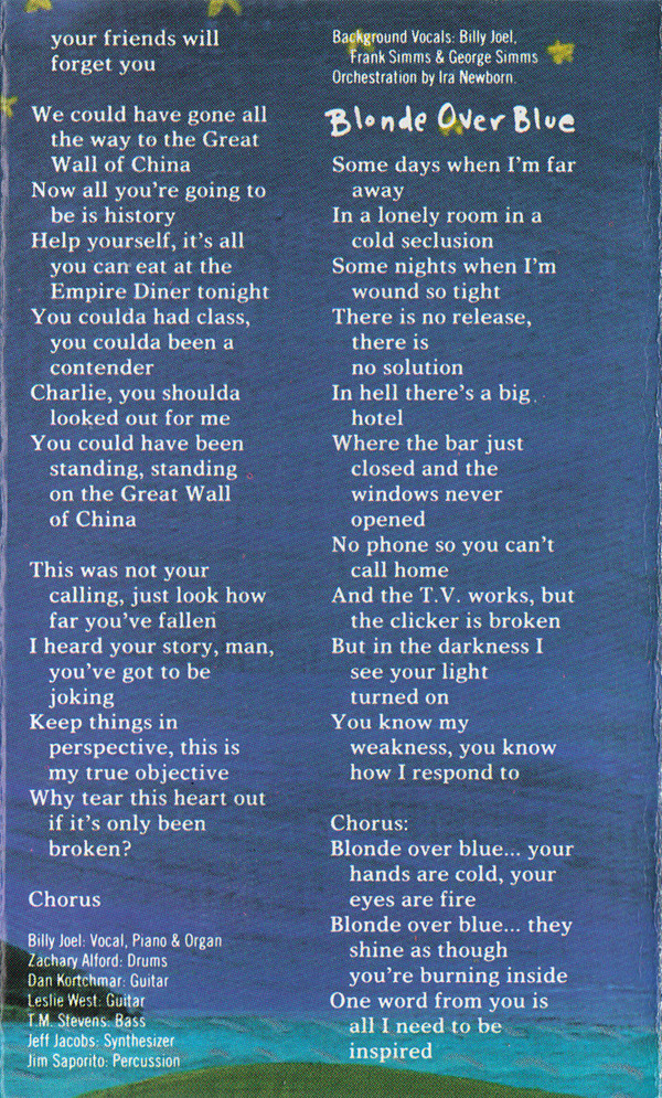 Backing Vocals – Frank Simms Backing Vocals – George Simms Backing Vocals – Billy Joel Bass – T.M. Stevens Drums – Zachary Alford Guitar – Leslie West Guitar – Danny Kortchmar Orchestrated By – Ira Newborn Percussion – Jim Saporito Synthesizer – Jeff Jacobs Vocals, Piano, Organ – Billy Joel |