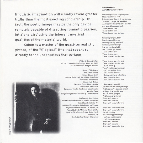 Aaron Neville Acoustic Guitar – Dean Parks Acoustic Guitar – Billy Joe Walker Jr. Arranged By [Strings], Conductor [Strings] – David Campbell Backing Vocals – Mona Lisa Young Backing Vocals – Alex Brown Backing Vocals – Jackie Gouche Bass – Willie Weeks Drums – Eddie Bayers Electric Piano [Wurlitzer] – Jim Cox Guitar – Steuart Smith Mixed By – Bill Schnee Pedal Steel Guitar – Paul Franklin Piano – Matt Rollings Producer – Steve Lindsey (4) Recorded By – Justin Niebank Recorded By [Additional] – Leanne Ungar Recorded By [Additional] – Rik Pekkonen Tambourine – Arno Lucas Technician [Assistant] – Jim DeMain Technician [Assistant] – Robert Charles |