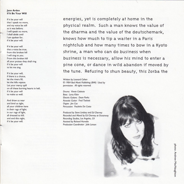 Jann Arden Acoustic Guitar – Fred Tackett Bass – Larry Klein Drums – Vinnie Colaiuta Electric Guitar – Dean Parks Organ – Jim Cox Percussion – Paulinho Da Costa Producer – Ed Cherney Producer – Steve Lindsey (4) Recorded By, Mixed By – Ed Cherney Technician [Assistant] – Richard "Segal" Huredia |