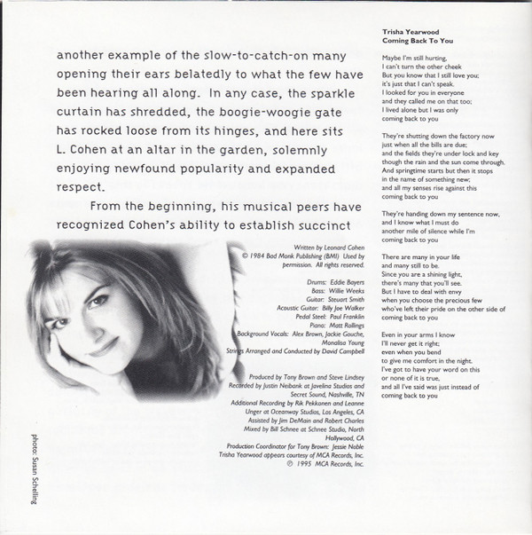 Trisha Yearwood Acoustic Guitar – Billy Joe Walker Jr. Arranged By [Strings], Conductor [Strings] – David Campbell Backing Vocals – Mona Lisa Young Backing Vocals – Alex Brown Backing Vocals – Jackie Gouche Bass – Willie Weeks Drums – Eddie Bayers Guitar – Steuart Smith Mixed By – Bill Schnee Pedal Steel Guitar – Paul Franklin Piano – Matt Rollings Producer – Tony Brown (4) Producer – Steve Lindsey (4) Recorded By – Justin Niebank Recorded By [Additional] – Leanne Ungar Recorded By [Additional] – Rik Pekkonen Technician [Assistant] – Jim DeMain Technician [Assistant] – Robert Charles |